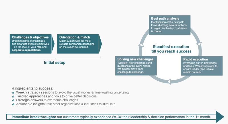 Our Executive Companion Program is not just a service; it's a partnership. We work closely with executives to understand their unique challenges and goals, crafting tailored solutions that drive sustainable growth and innovation. It combines the strengths of consulting, interim management, coaching, and mentoring into a fully customized experience for long-term relevance and sustainable result, going beyond traditional approaches.